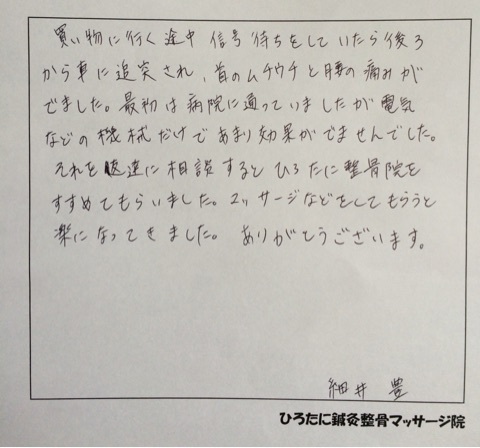 買い物に行く途中信号待ちをしていたら後ろから車に追突され、首のムチウチと腰の痛みがでました。